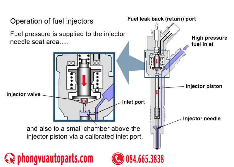 Khi cuộn solenoid được kích hoạt (energized), van kim phun mở ra. Lúc này, áp suất nhiên liệu phía trên piston kim phun được giải phóng (relieved), và một phần nhiên liệu sẽ hồi về bình chứa thông qua hệ thống đường hồi (return system). Sự thay đổi này tạo ra độ chênh lệch áp suất giữa phía trên và phía dưới piston kim phun, khiến piston dịch chuyển và kim phun được nâng lên khỏi đế, chuẩn bị cho quá trình phun nhiên liệu áp suất cao vào buồng đốt. Đây là nguyên lý cơ bản của cơ cấu điều khiển phun nhiên liệu điện tử trong hệ thống Common Rail Diesel, nơi áp suất được điều tiết bằng tín hiệu điện tử nhằm đảm bảo thời điểm phun và lượng phun cực kỳ chính xác.